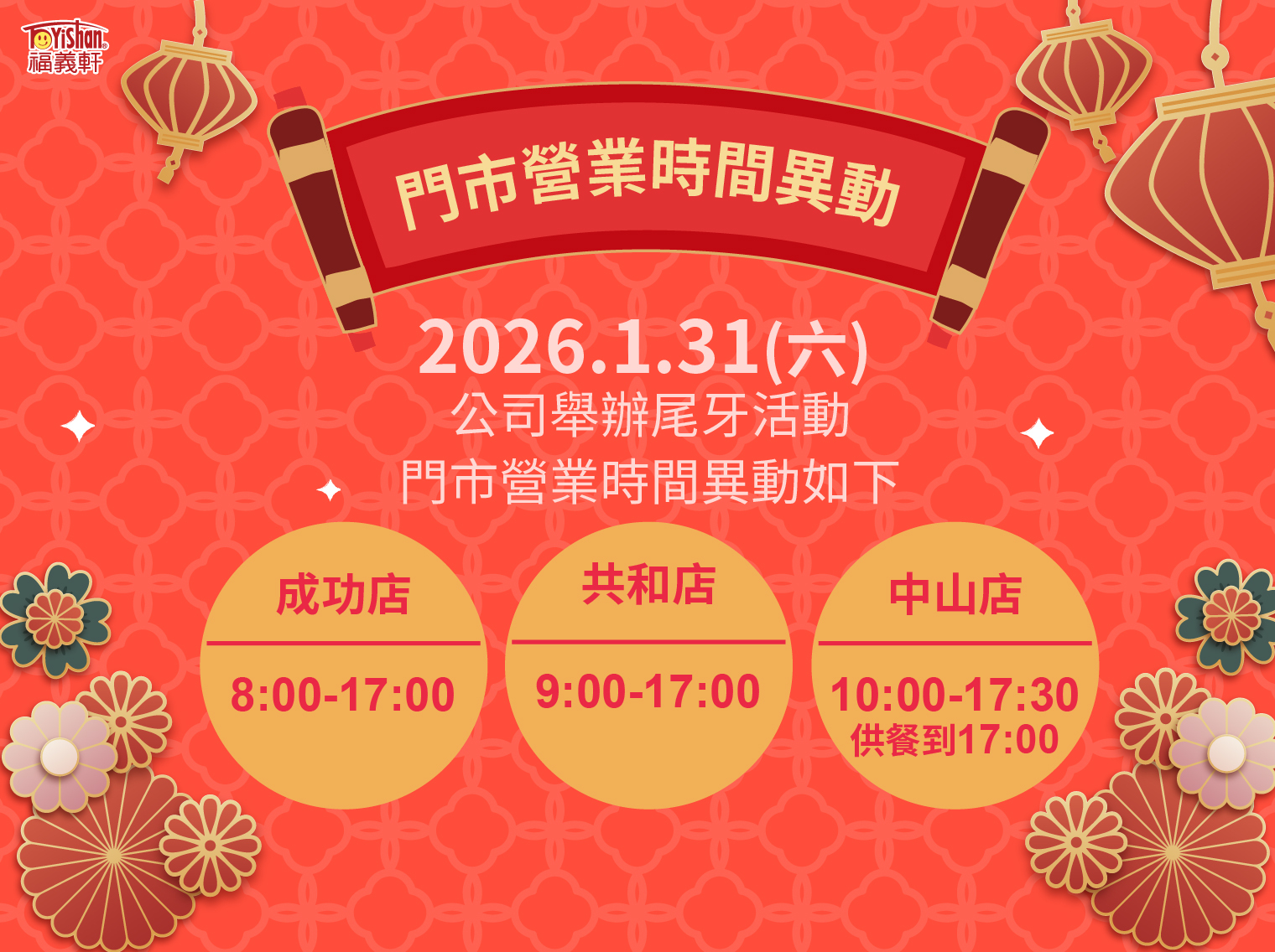 中山門市營業到17:30(供餐到17:00)