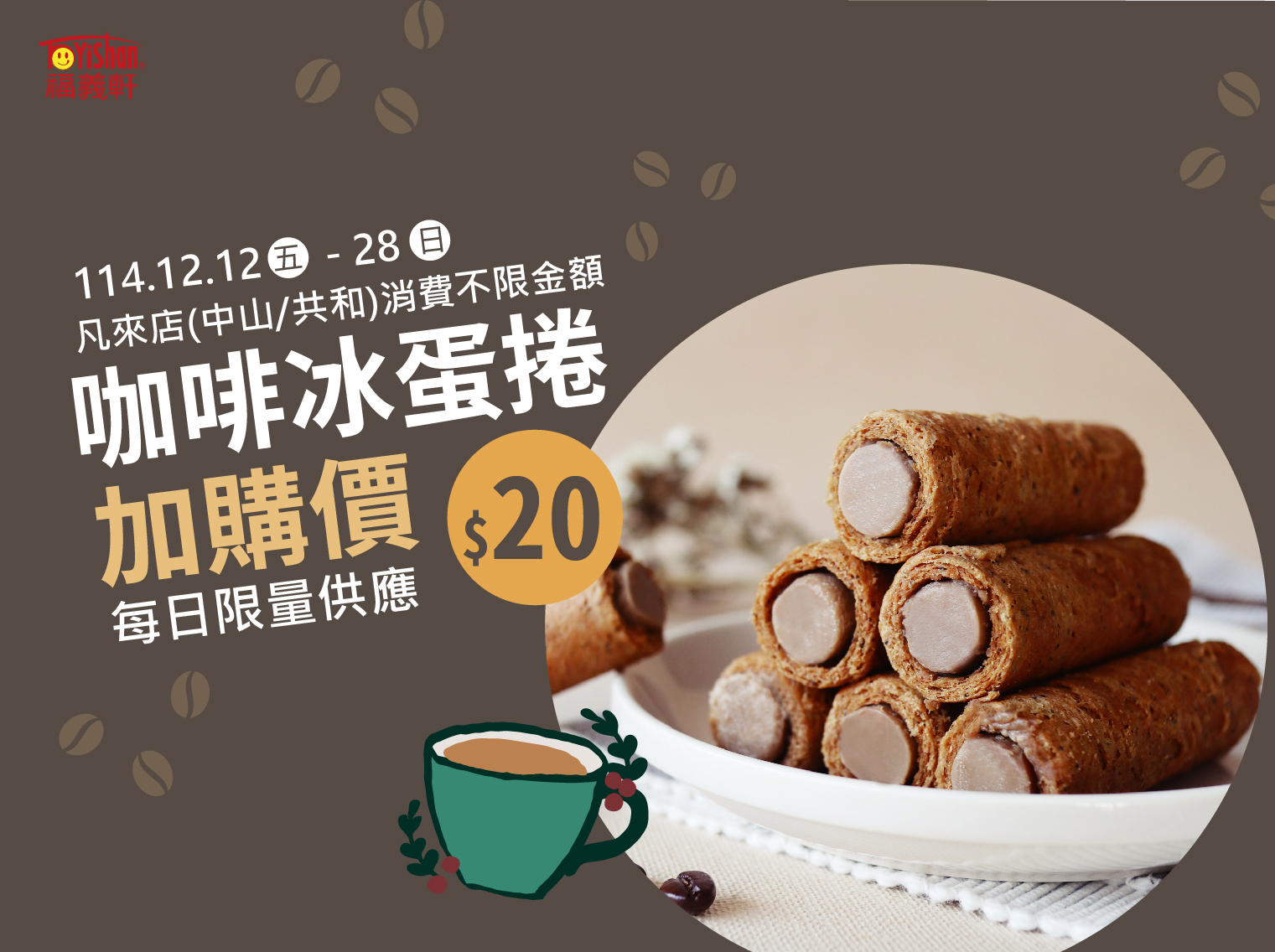 ☕咖啡的香,遇上蛋捲的脆,一口就上癮。12/12-28咖啡冰蛋捲,中山店及共和店限定,不限金額加購只要銅板價$20,數量有限要買要快!!
