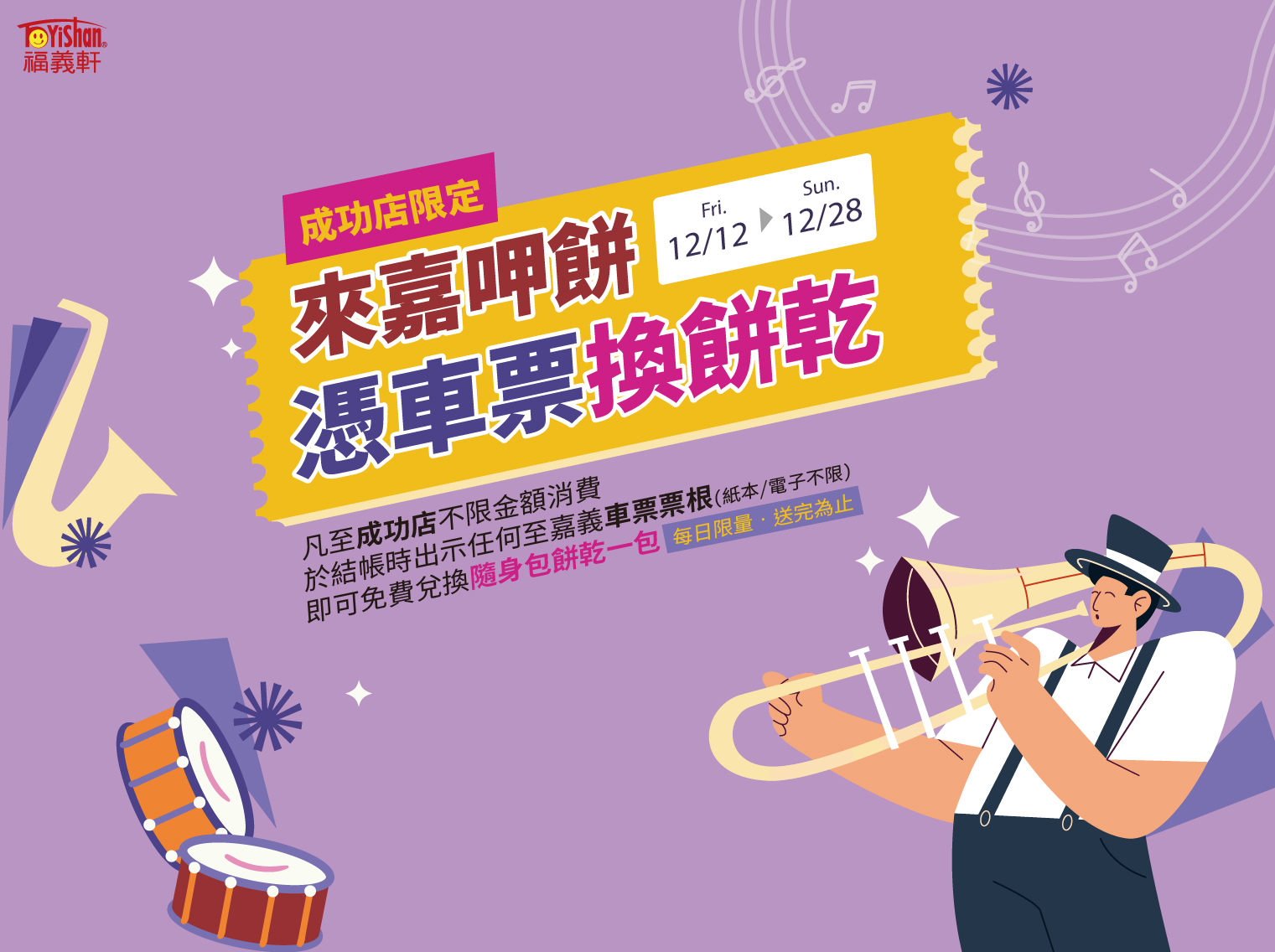 114/12/12~12/28凡至成功店不限金額消費,於結帳出示任何至嘉義車票票根,即可免費兌換隨身包餅乾一包,每人限領一包,限量贈送,送完為止。